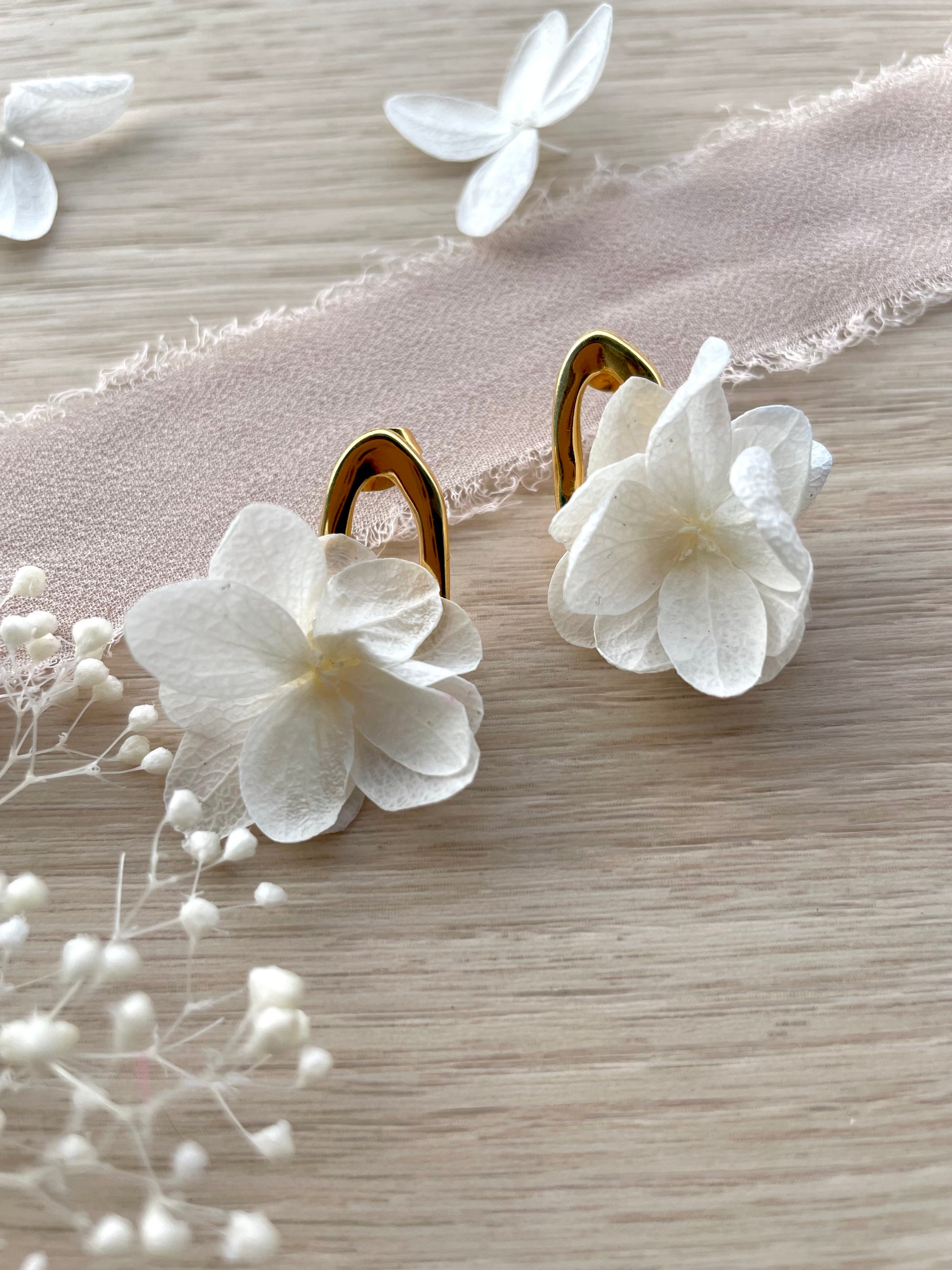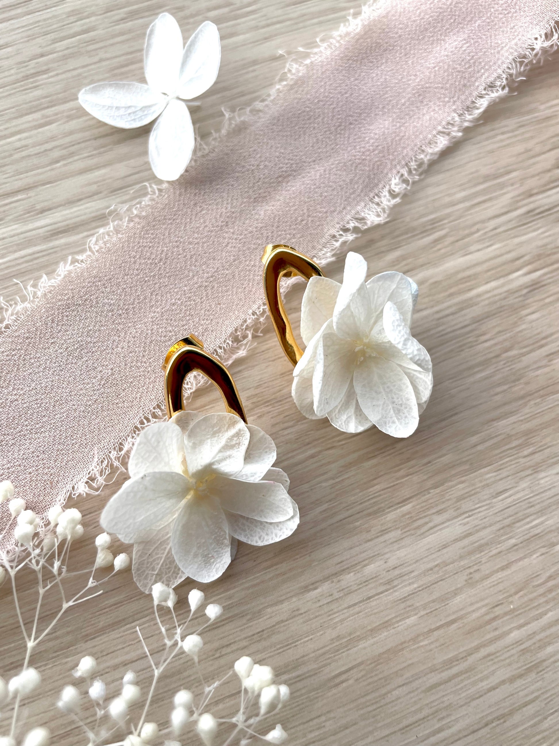 - Design : Boucles discrètes avec clou irrégulier dorés, ornées de fleurs naturelles stabilisées