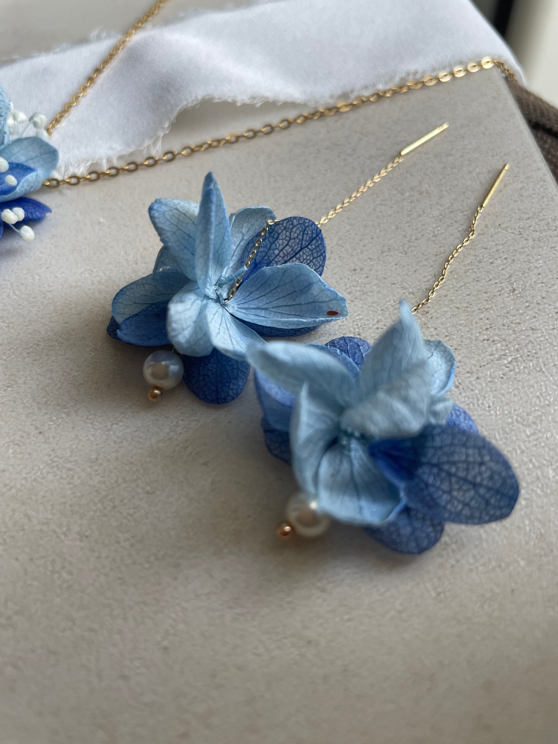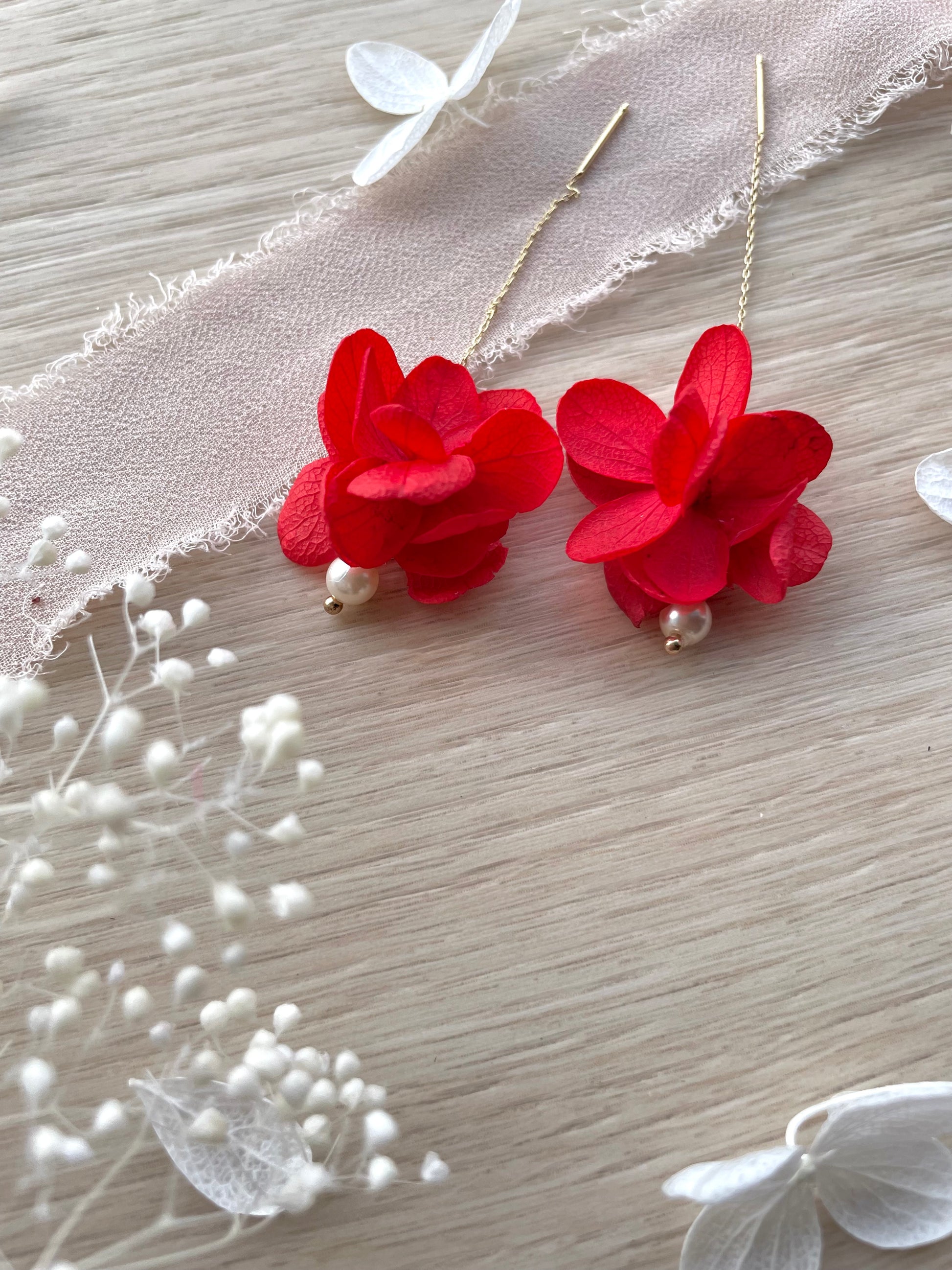 Design : Boucles longues et légères, ornées de fleurs stabilisée et de perles pendantes