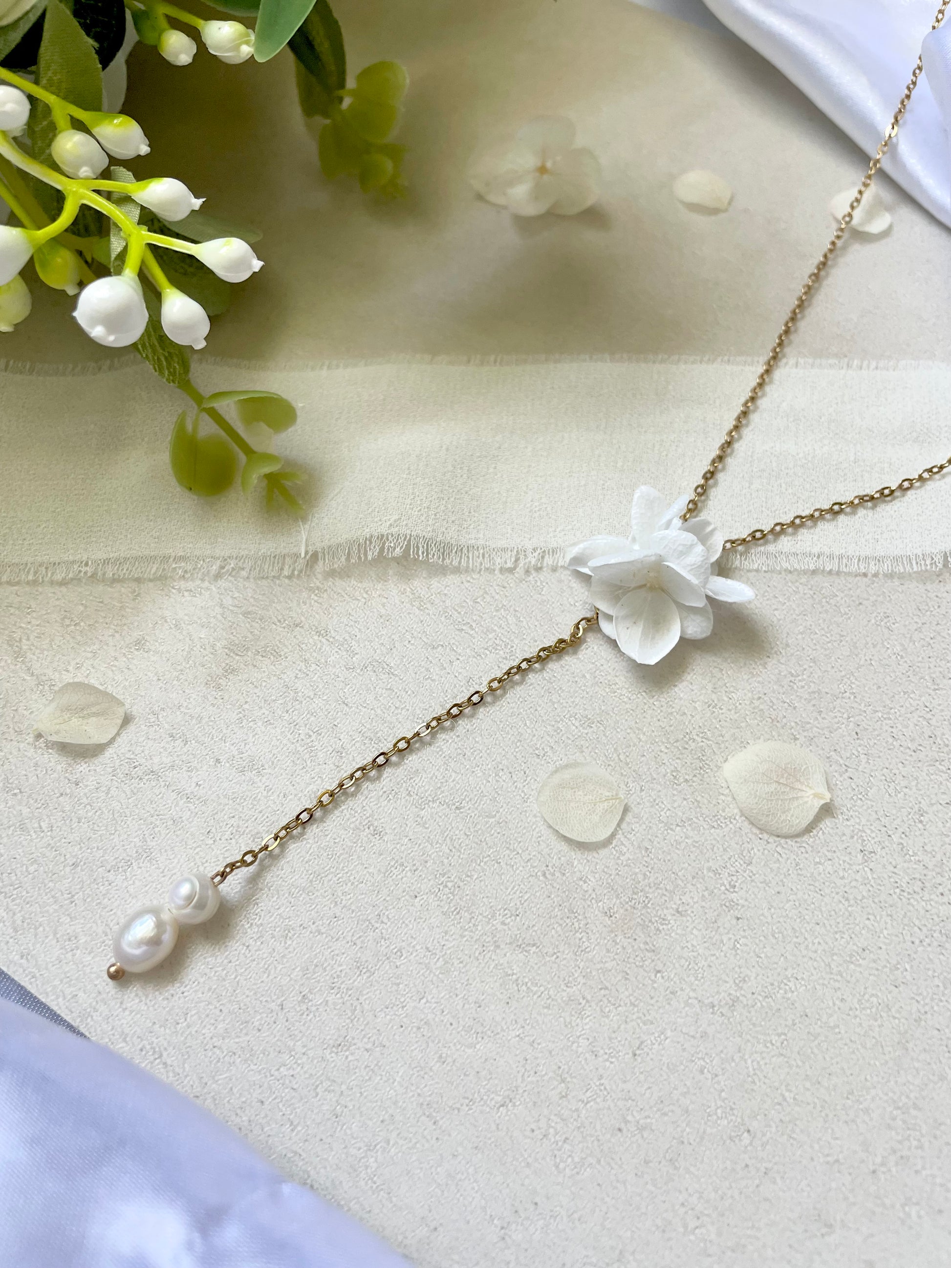 Symbole de pureté et de délicatesse, ce collier se distingue par son design épuré et poétique. Une fleur d’hortensia, soigneusement stabilisée, s’épanouit au creux du cou, avec chaîne fine dorée à l’or fin se prolonge par deux perles d’eau douce, apportant une touche de grâce et de mouvement.