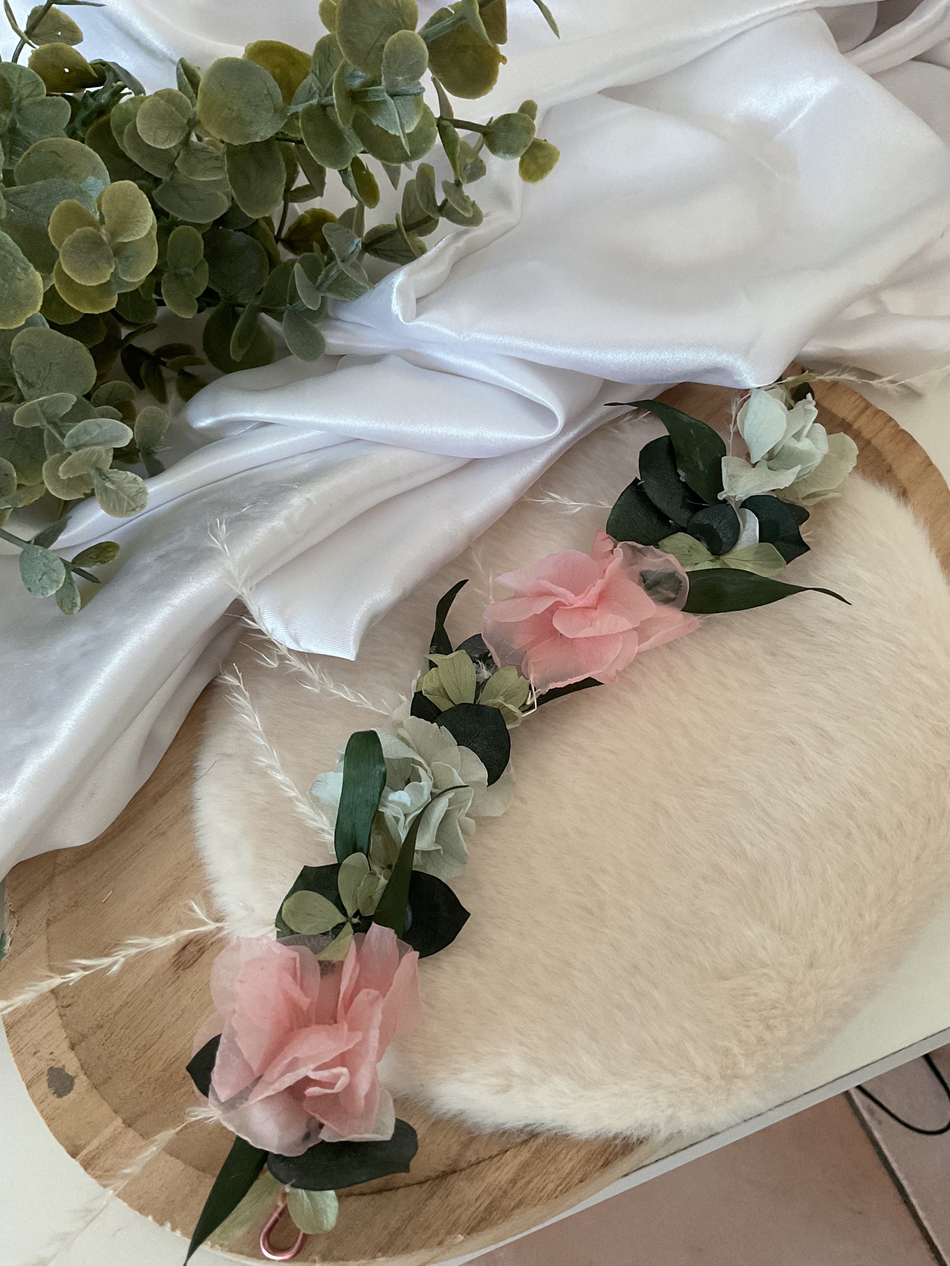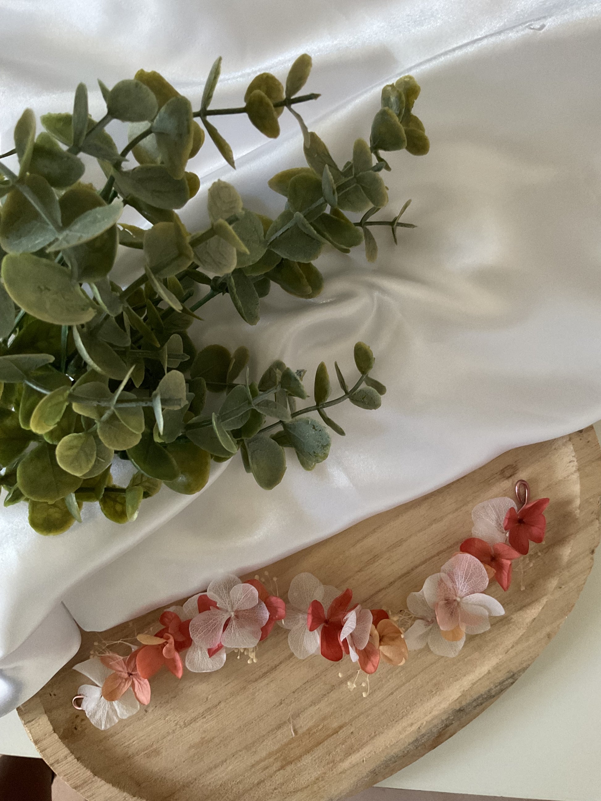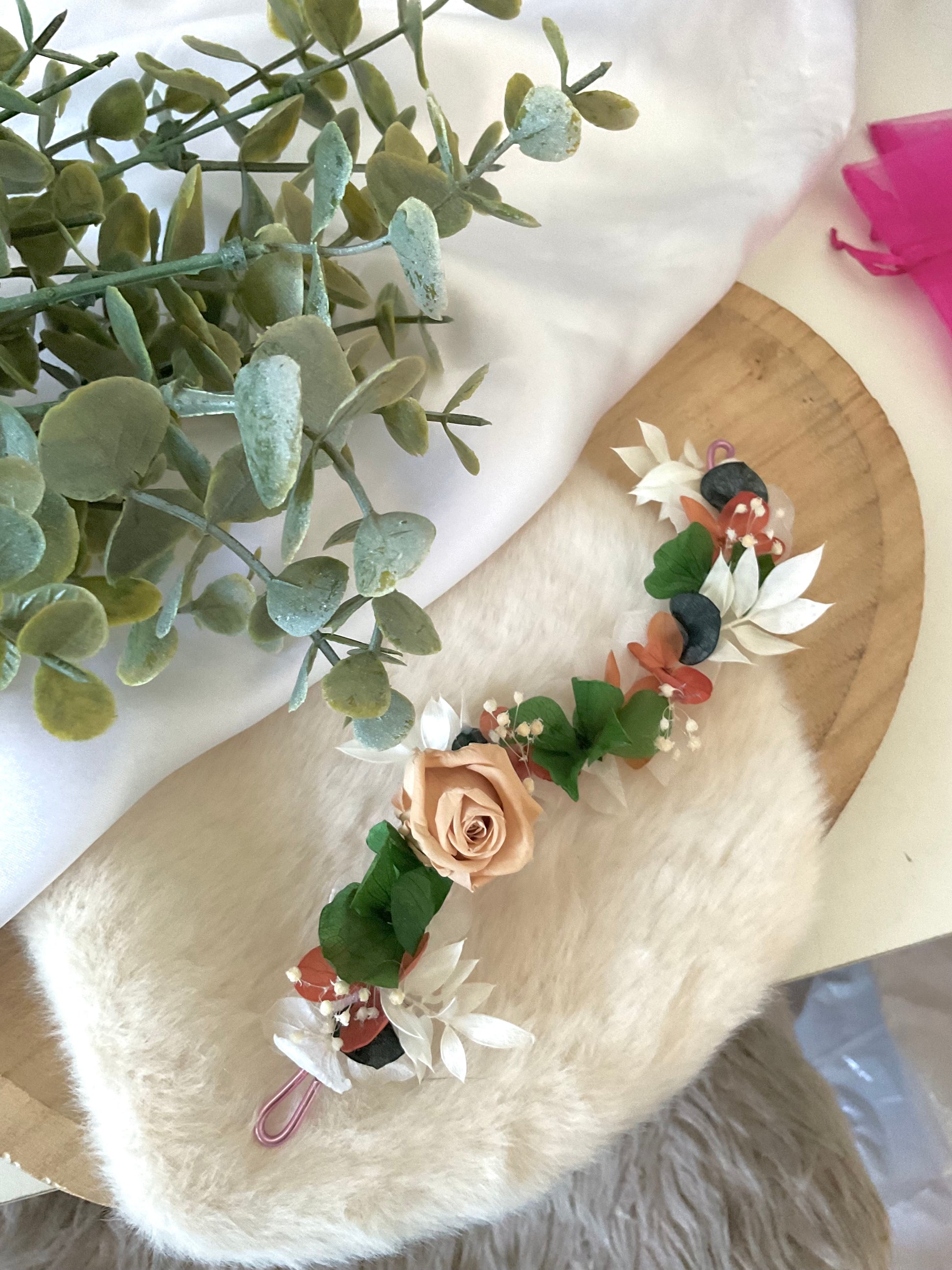 Sublimez votre coiffure avec notre demi-couronne en fleurs stabilisées, un accessoire intemporel et délicat. Chaque pièce est confectionnée à la main avec des fleurs soigneusement sélectionnées, préservées pour conserver leur beauté naturelle. Parfaite pour les mariées, demoiselles d'honneur ou toute occasion spéciale.