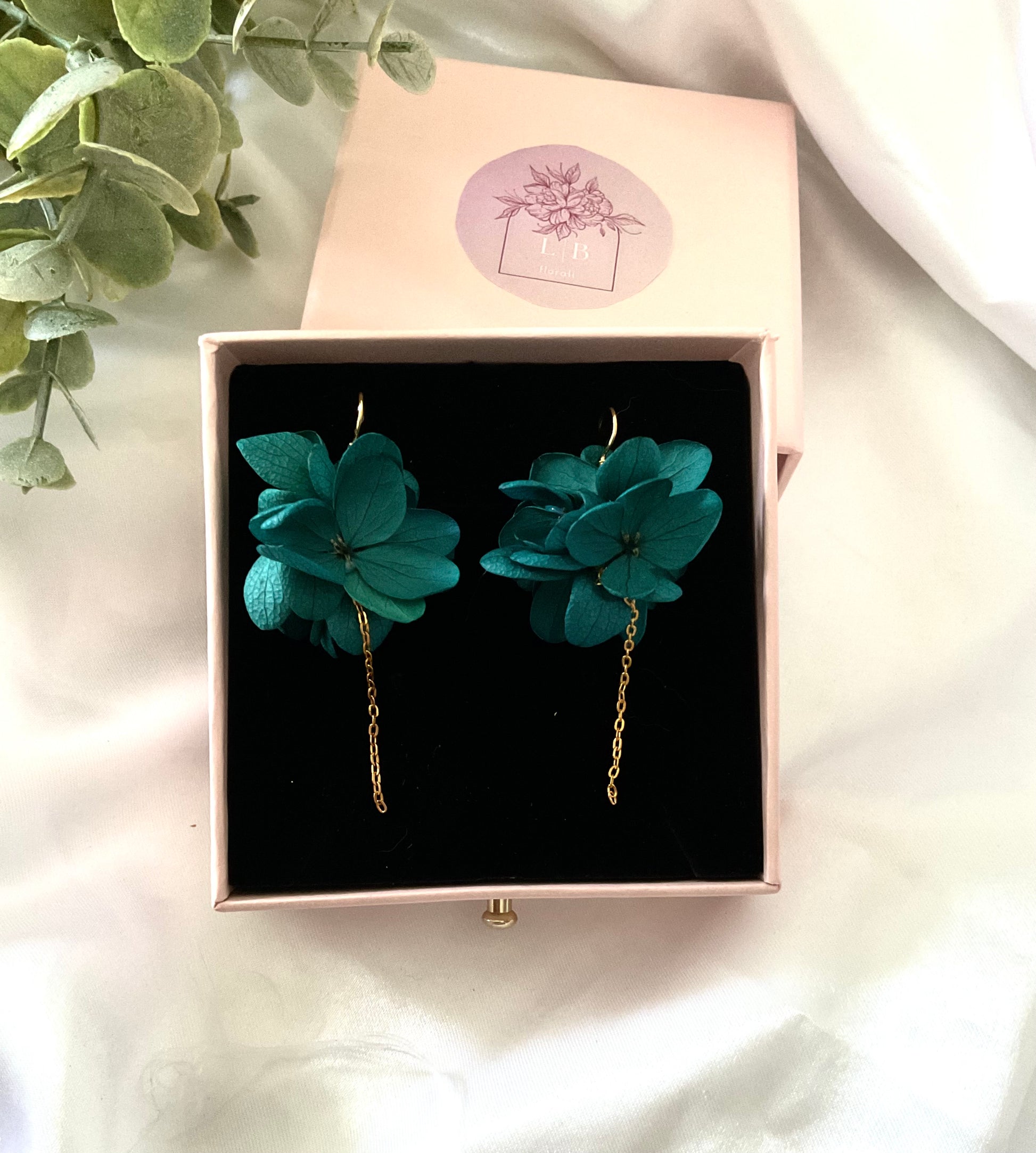 Des boucles d’oreilles pendantes élégantes composées d'une fine chaîne dorée ou argentée et de fleurs d’hortensias stabilisées, pour un look chic et intemporel.