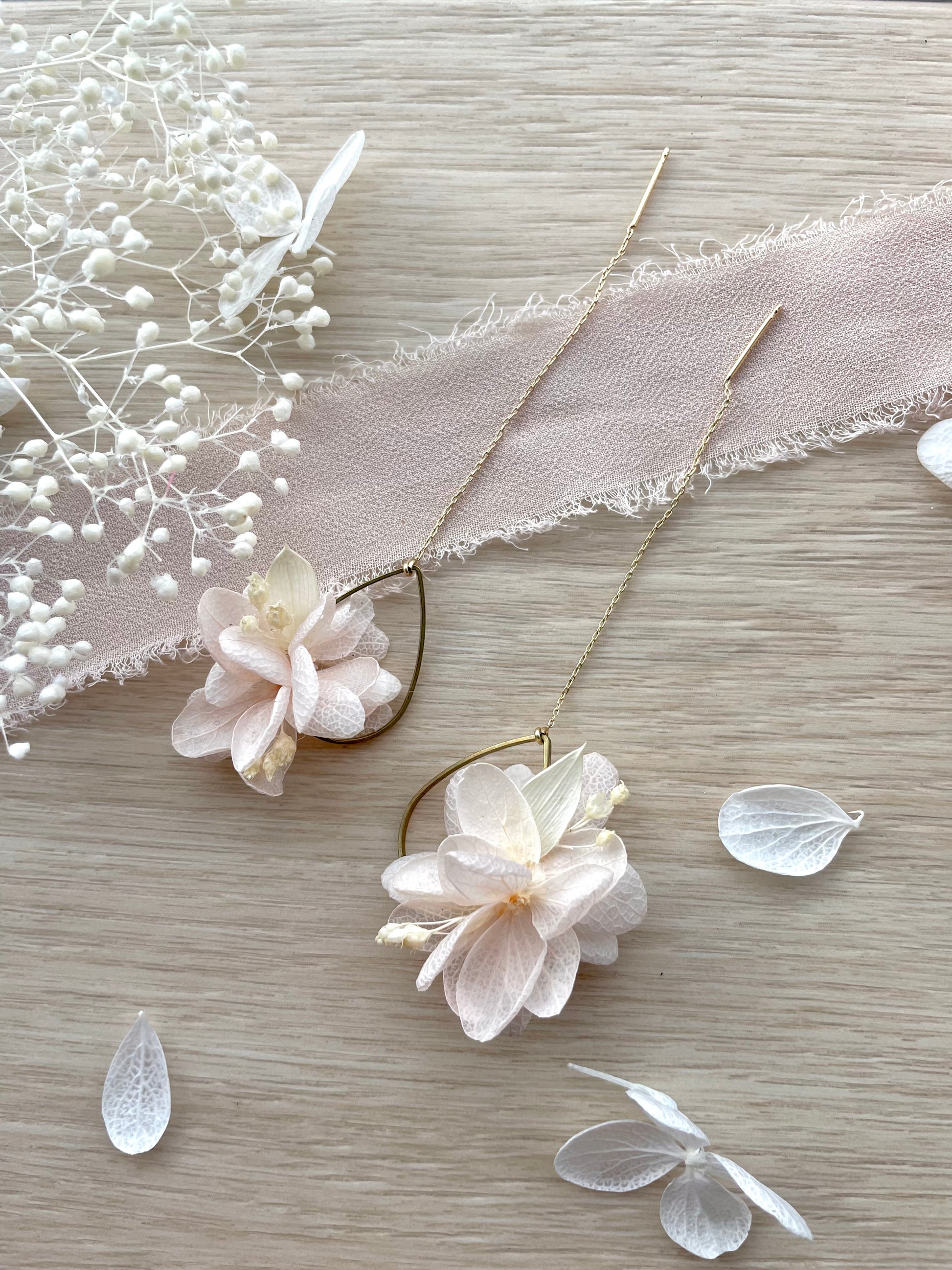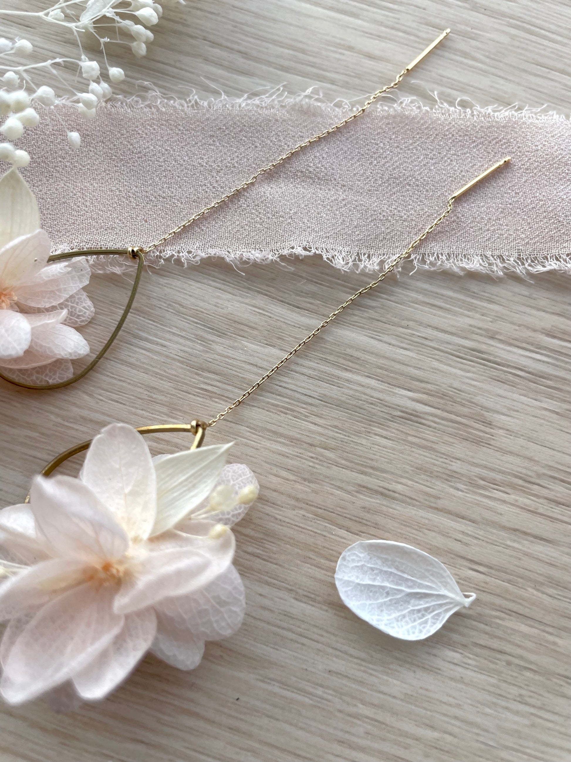 - Design : Boucles pendantes avec chaîne fine dorée, ornées d’une fleur en tissu effet soie