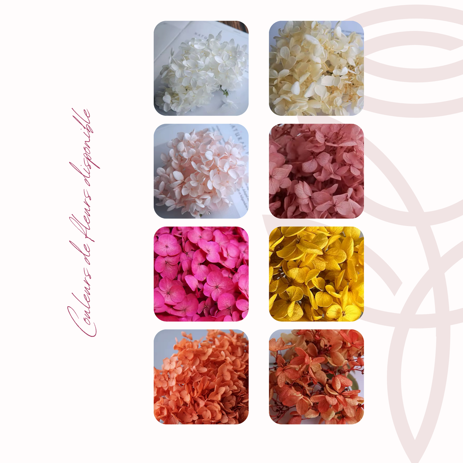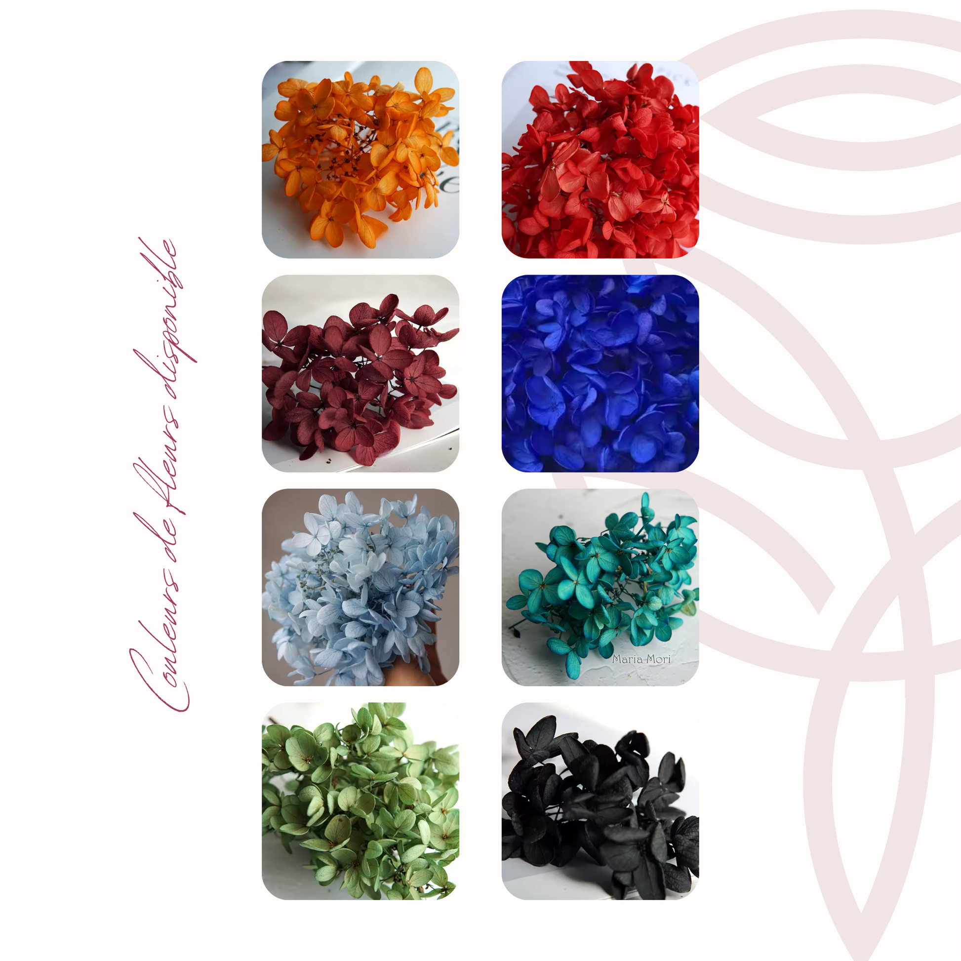 - Décorés d’une fleur d’hortensia naturelle stabilisée, fine et délicate