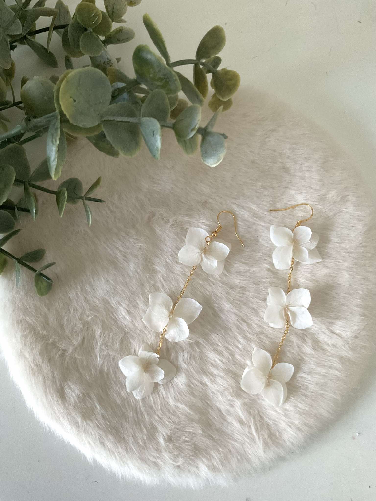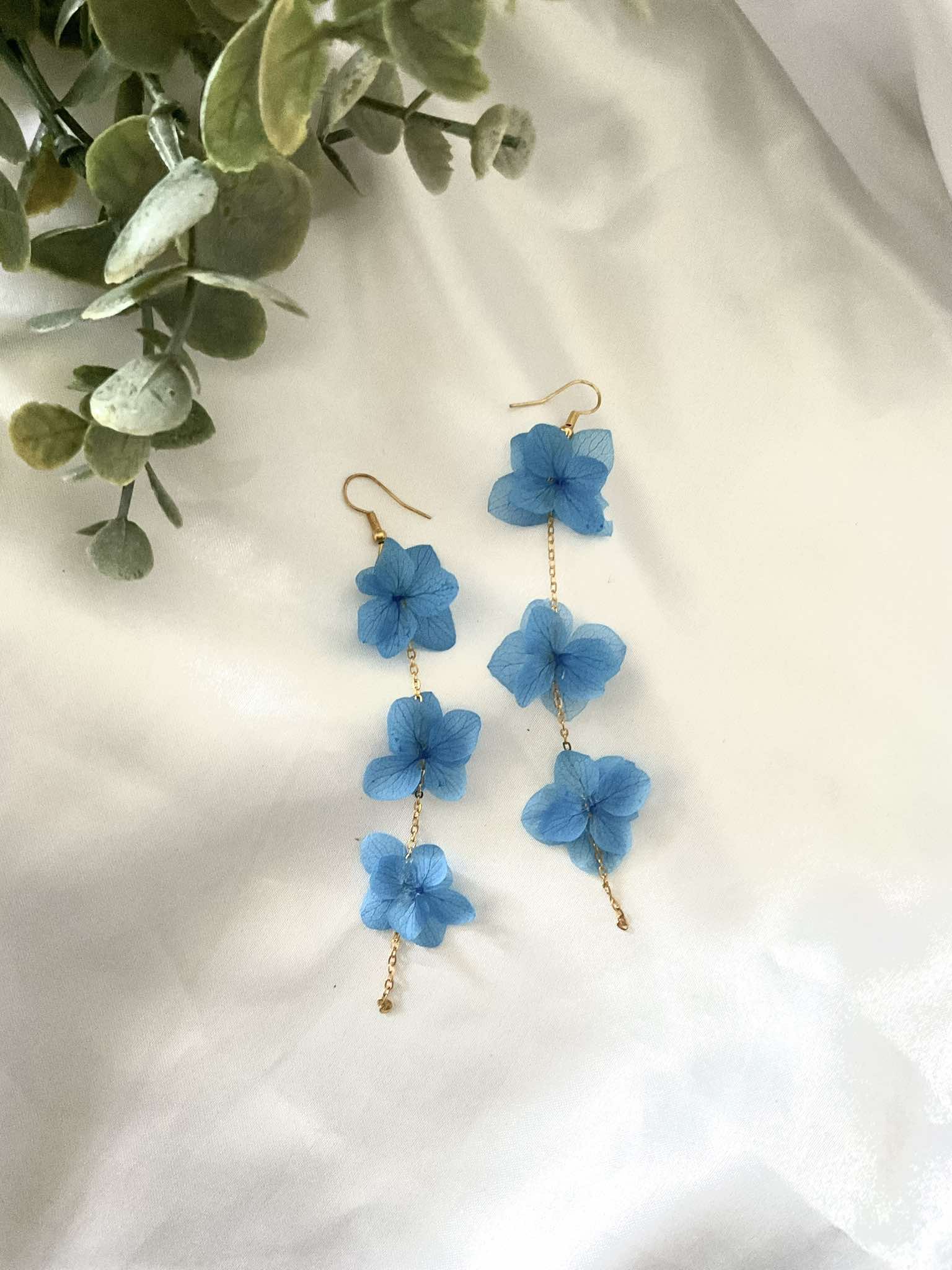 Des boucles d’oreilles pendantes élégantes ornées de trois fleurs d’hortensia stabilisées, alliant naturel et sophistication pour un style unique et intemporel.