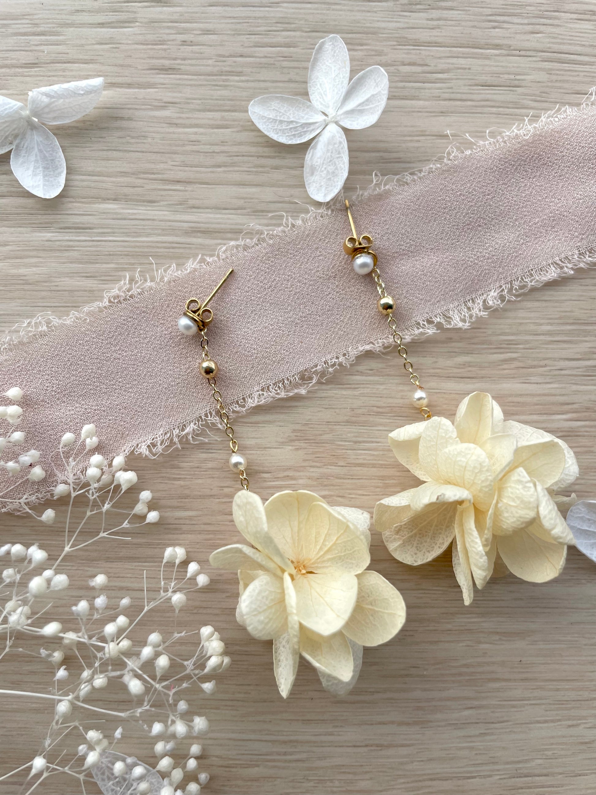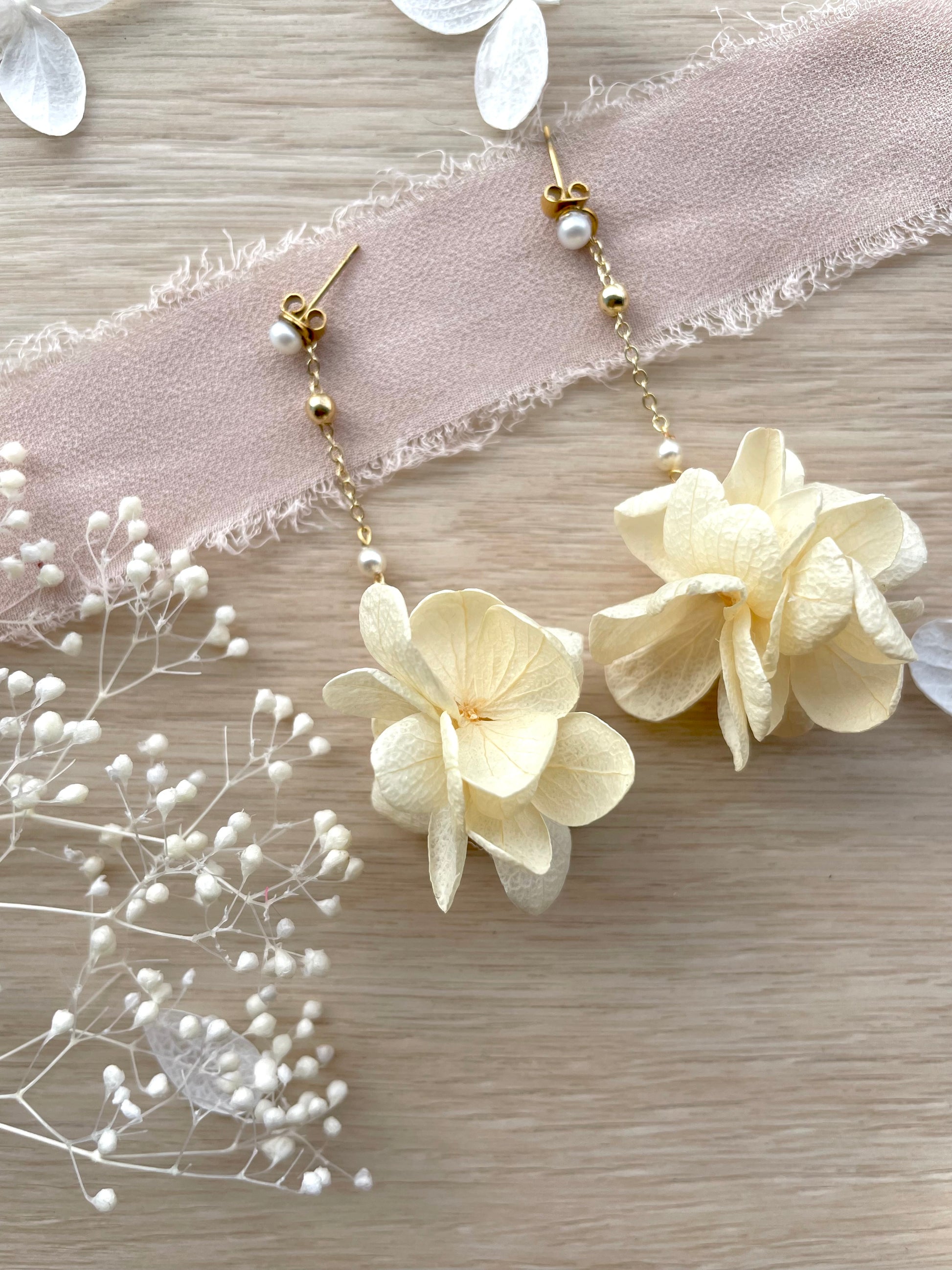 - Design : Boucles pendantes longues, avec chaînes dorées et fleurs stabilisées en finition crème