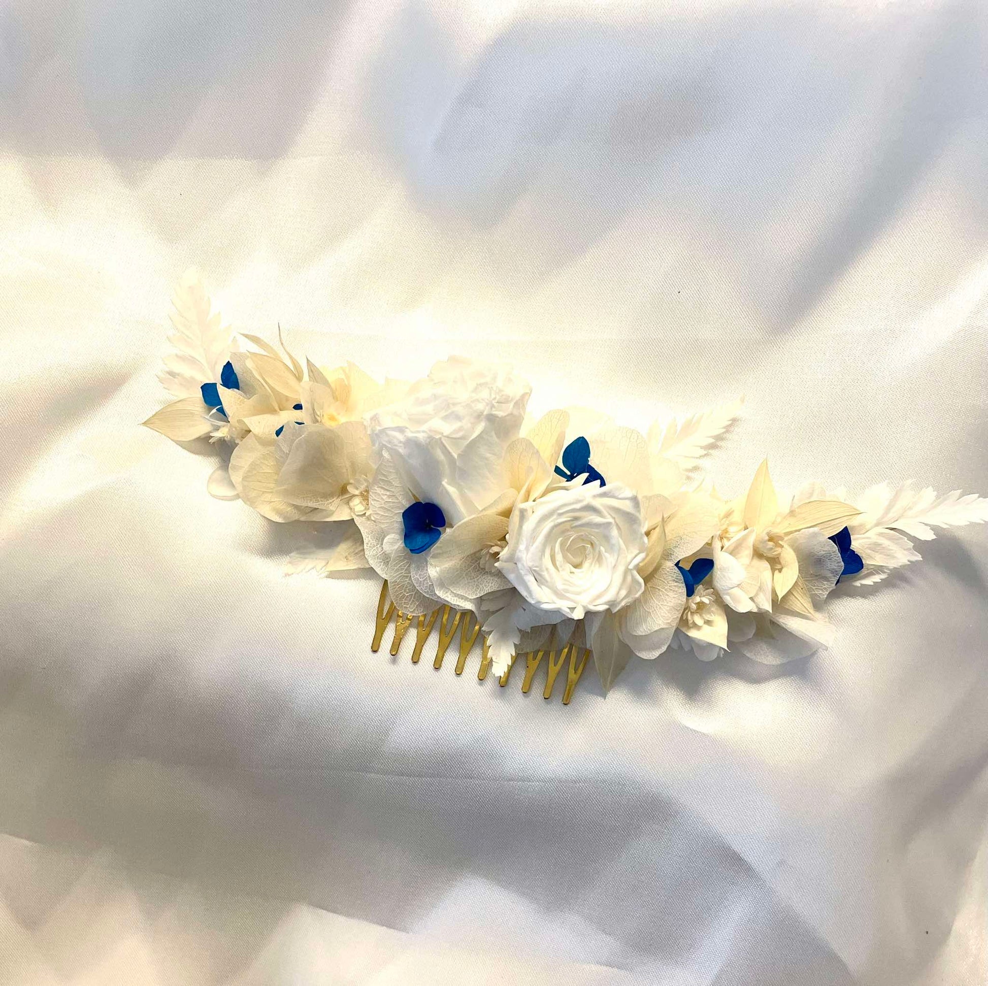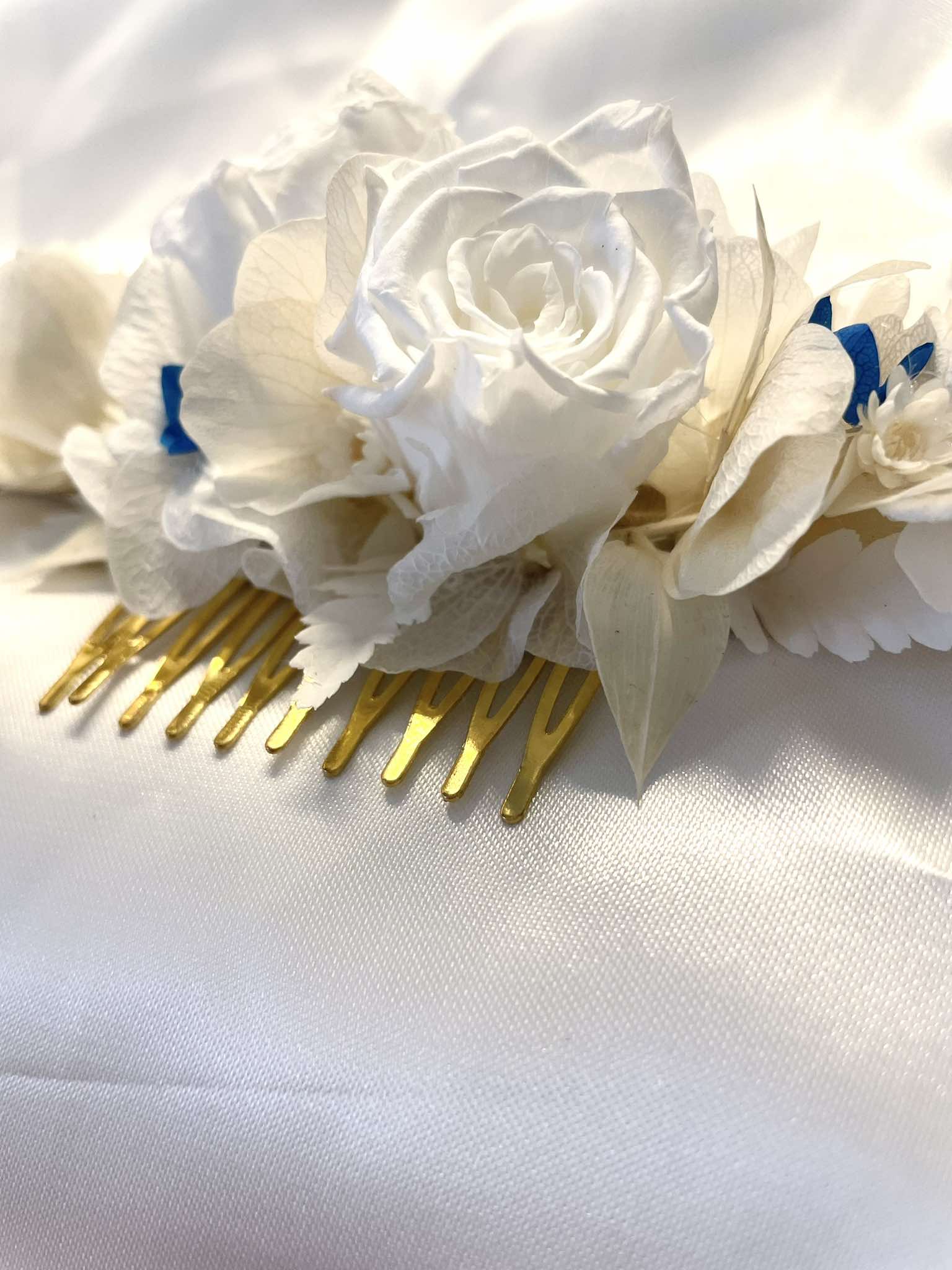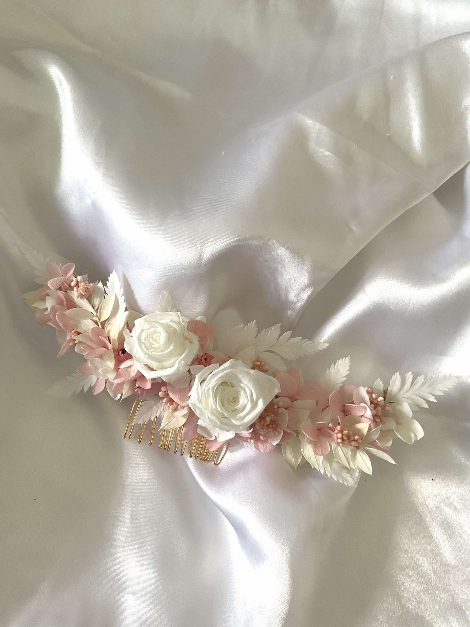Composition : Fleurs stabilisées (roses, hortensias, gypsophile, feuillage...), montées sur un peigne en métal doré/argenté.