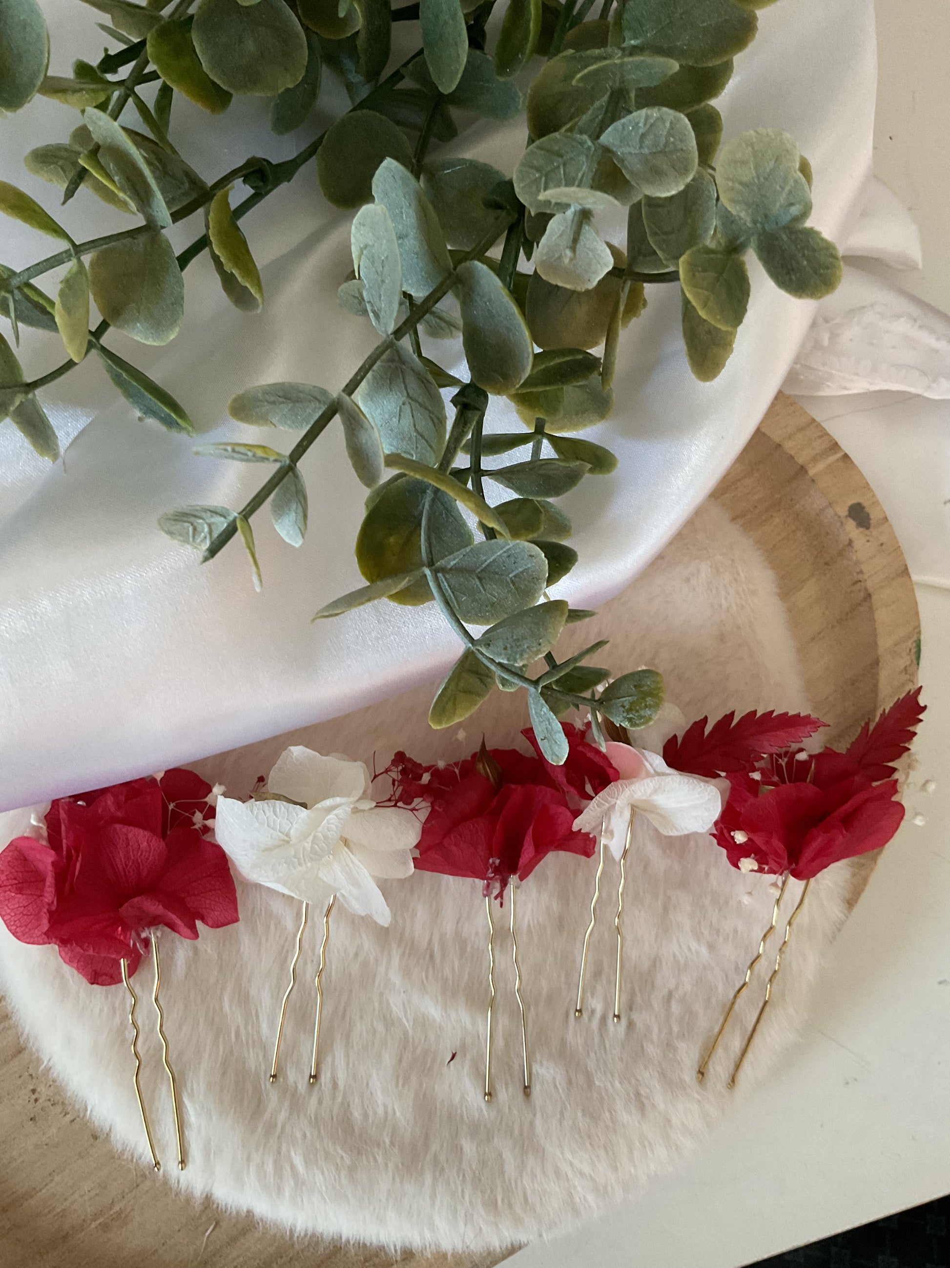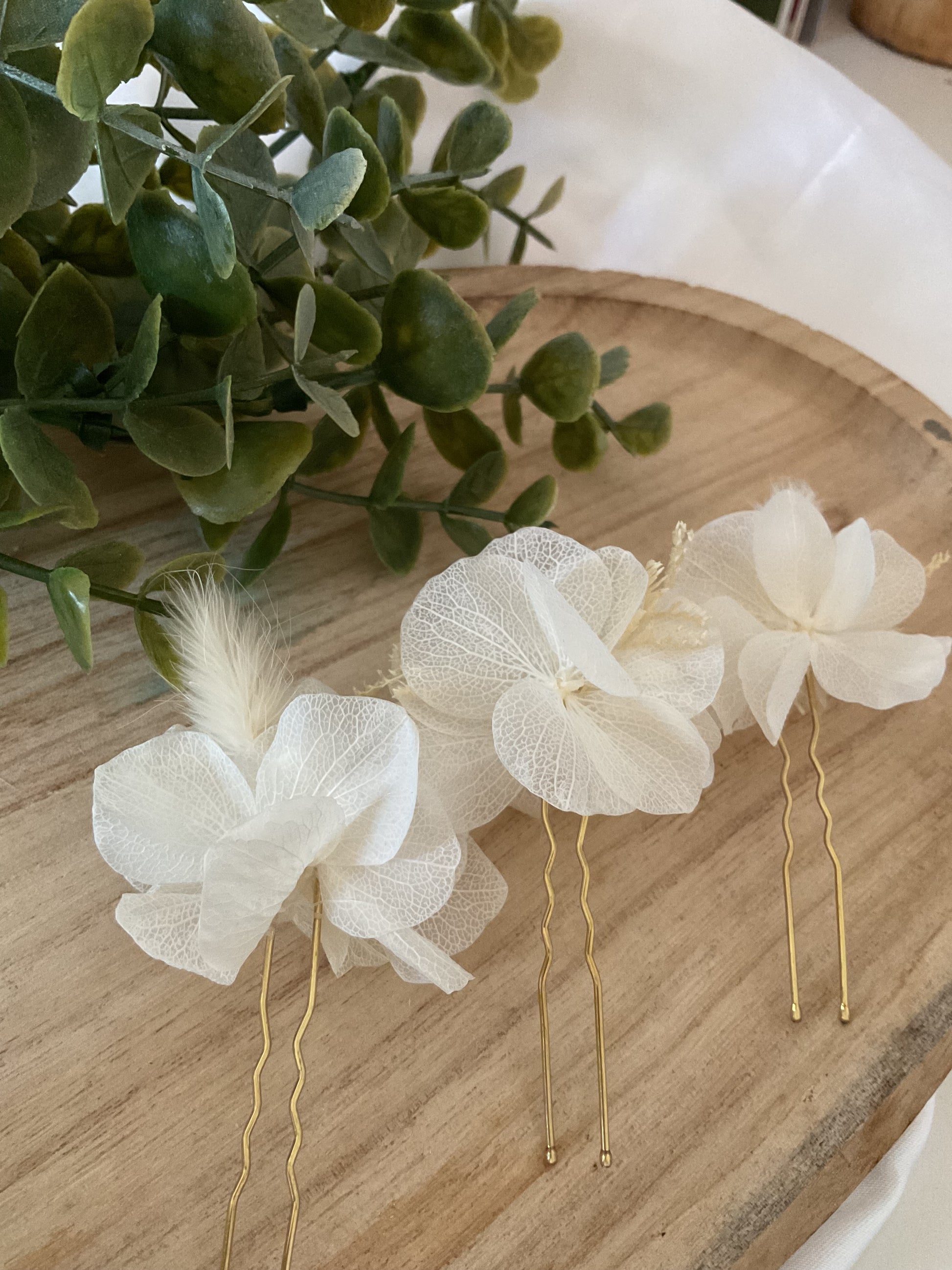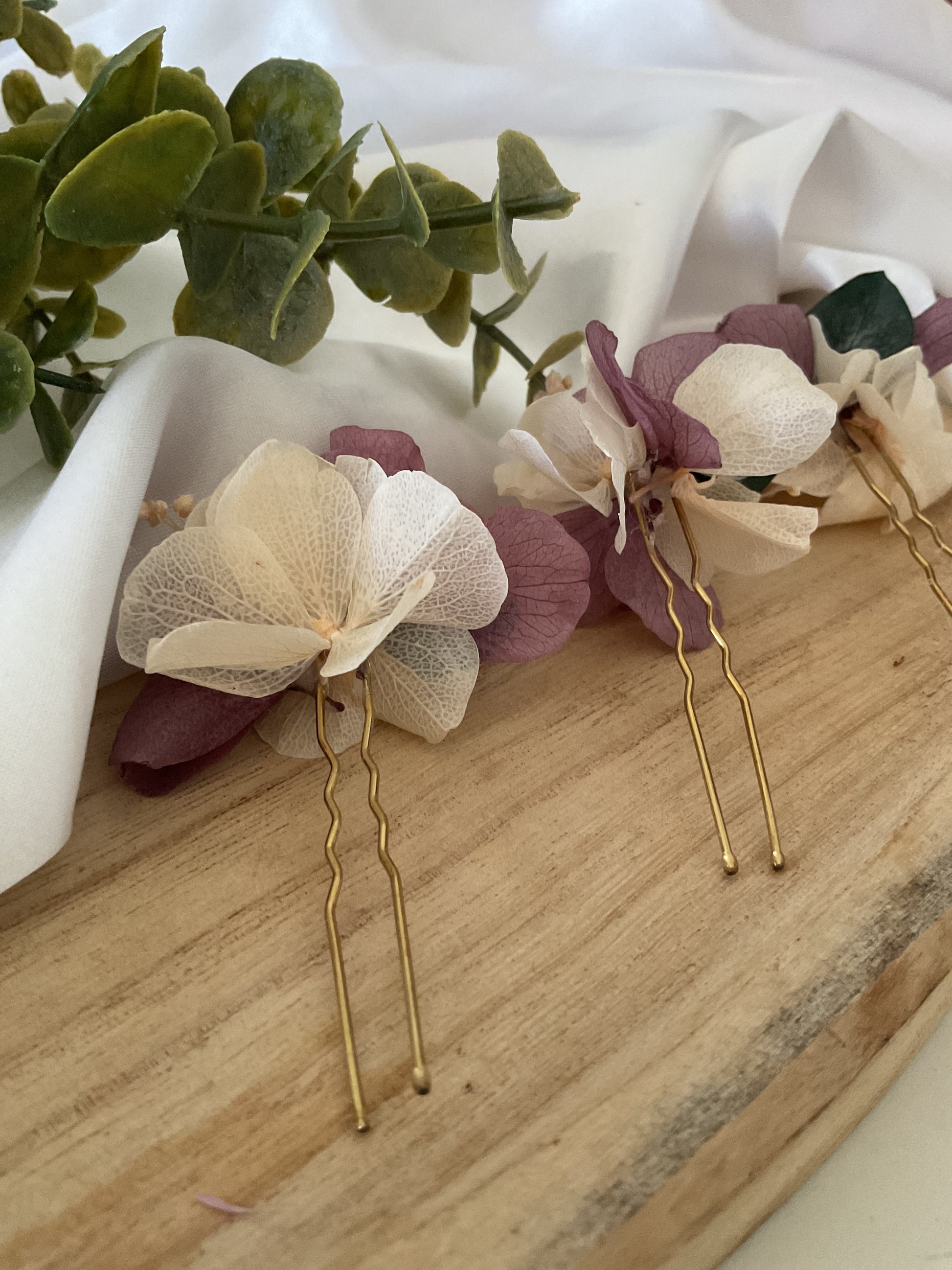 Ajoutez une touche romantique et poétique à votre coiffure avec notre pic à chignon en fleurs stabilisées. Confectionné à la main avec des fleurs naturelles préservées, il sublime vos cheveux avec délicatesse et élégance. Idéal pour les mariées, demoiselles d'honneur ou toute occasion spéciale.