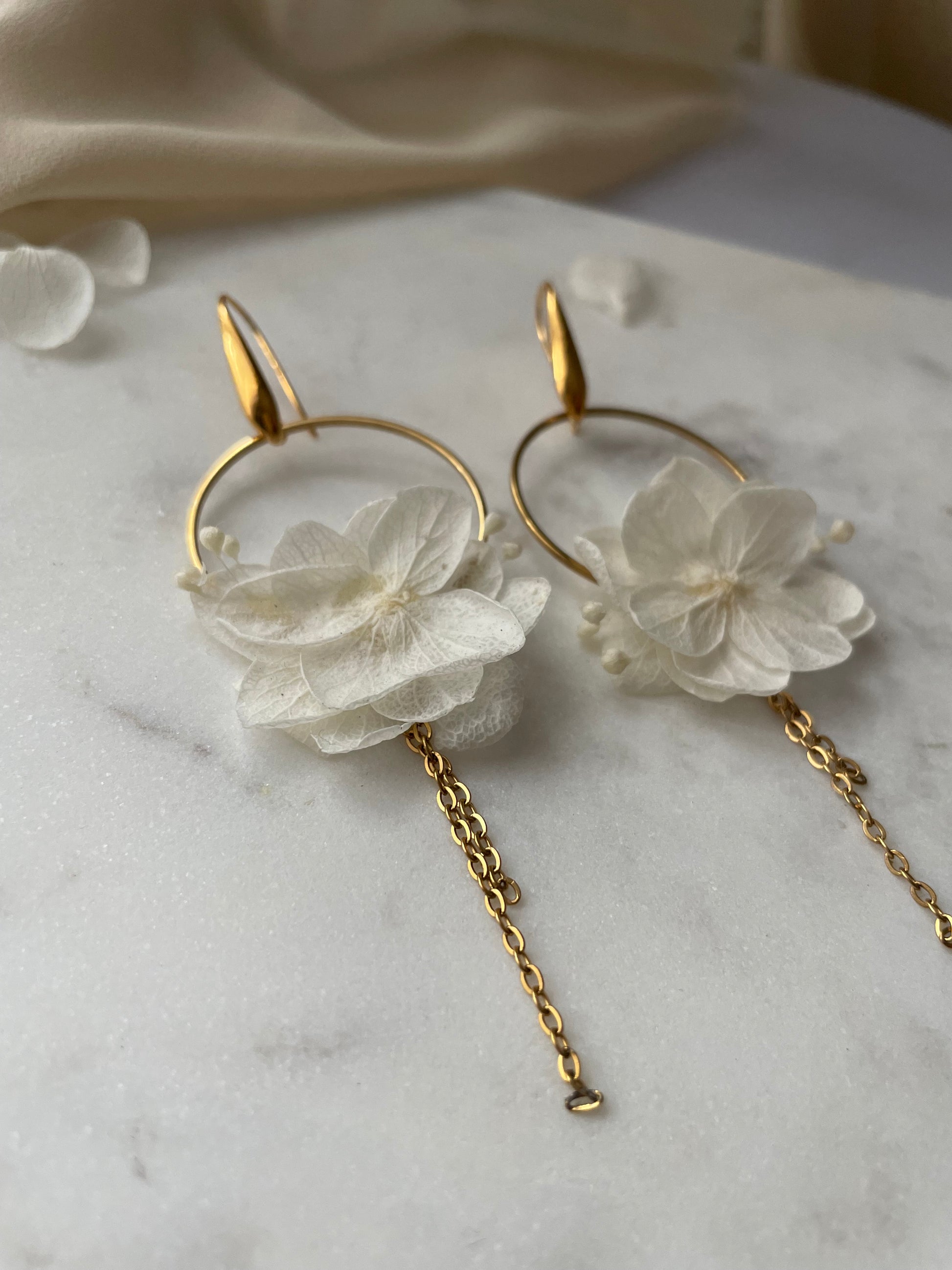 - Décorées d’une fleur d’hortensia naturelle stabilisée, fine et poétique