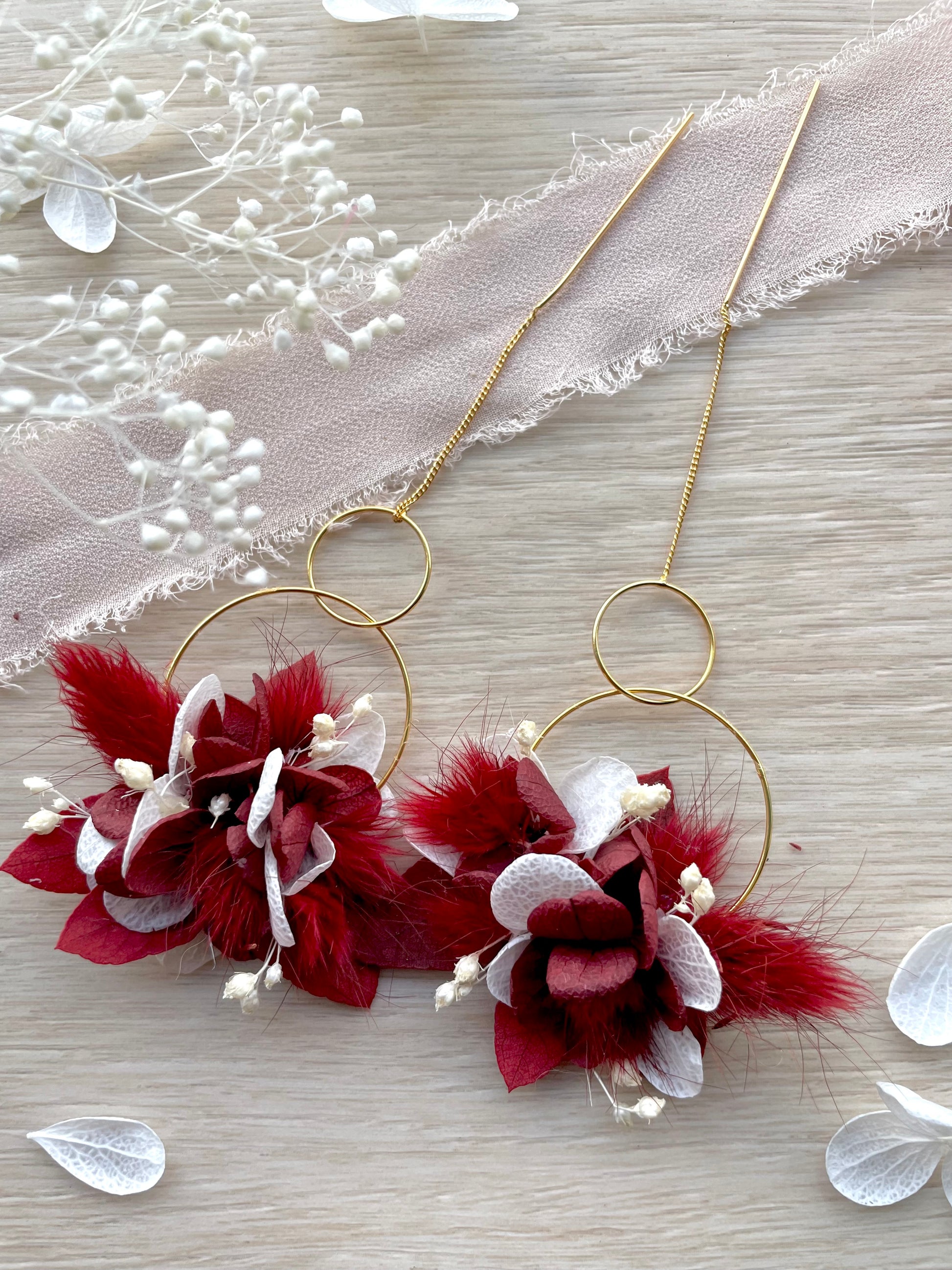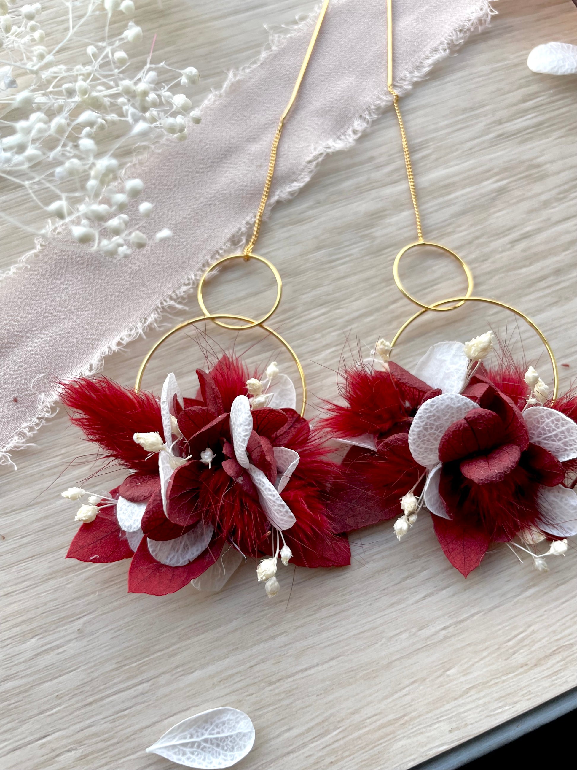 • Design : Boucles longues à chaînette dorée, ornées de fleurs stabilisé et d’éléments naturels séchés